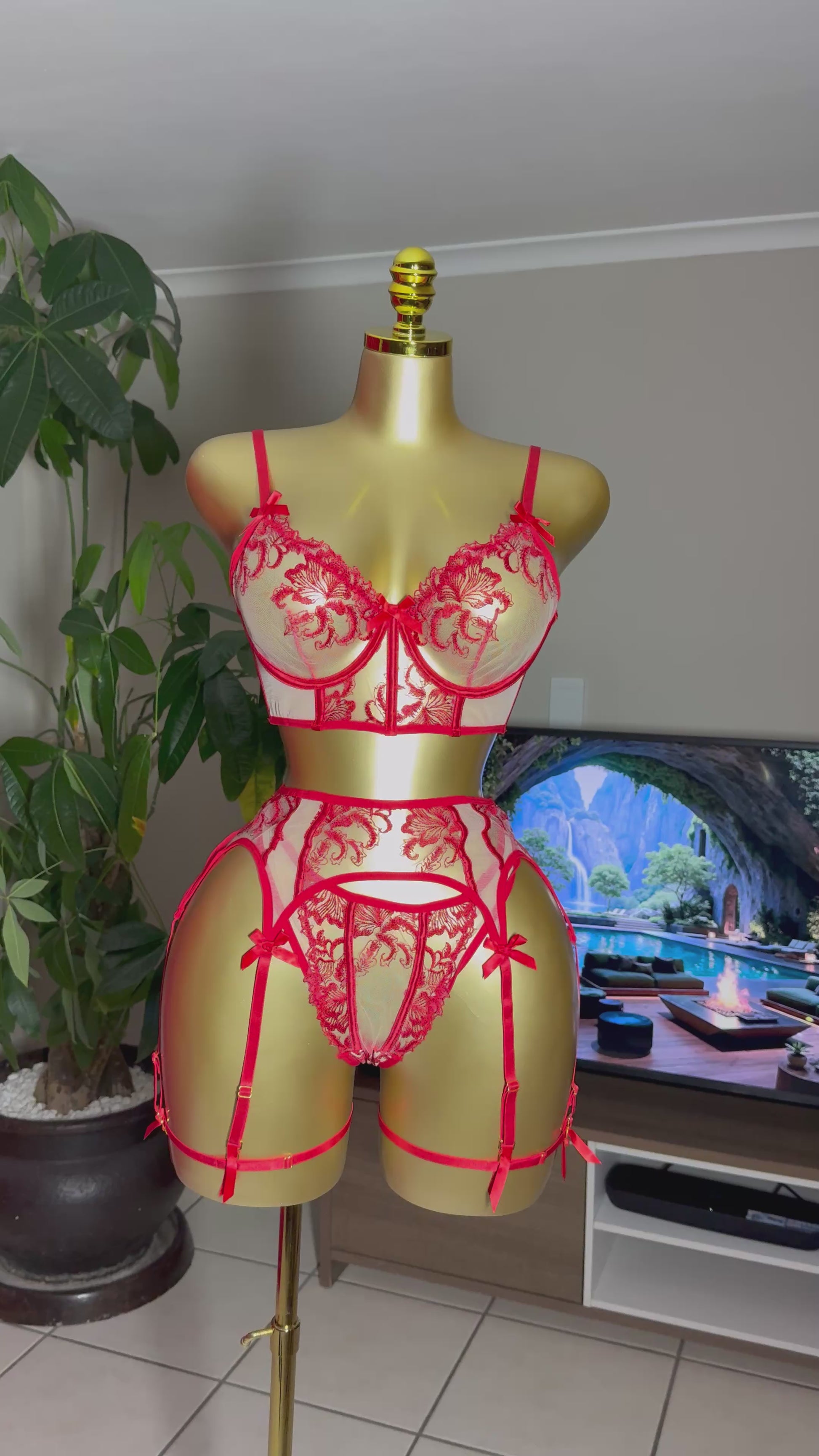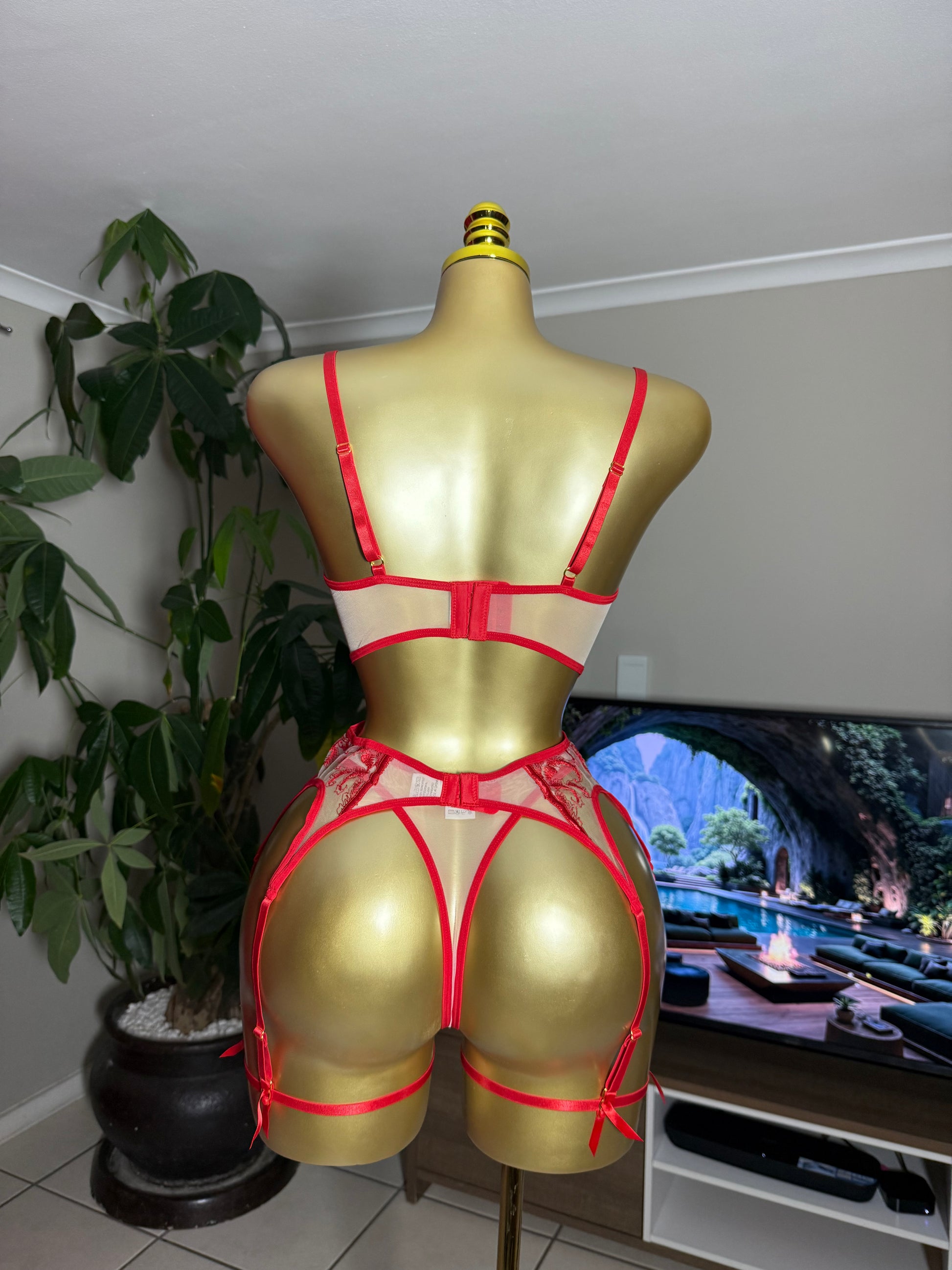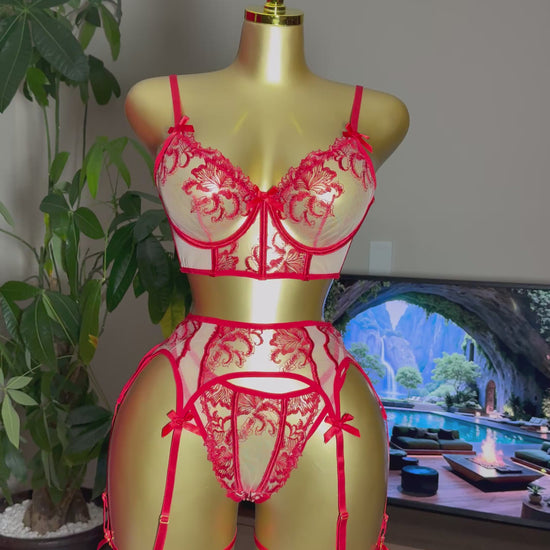 Bold, daring, and unforgettable — the Flame Muse lingerie set captures pure passion. With sheer mesh, striking red embroidery, and a longline bra paired with a garter belt and thong, this set is designed for maximum seduction. Shop online with Midnight Muse or visit our Brackenfell Showroom in Cape Town, South Africa to experience Flame Muse in person.
