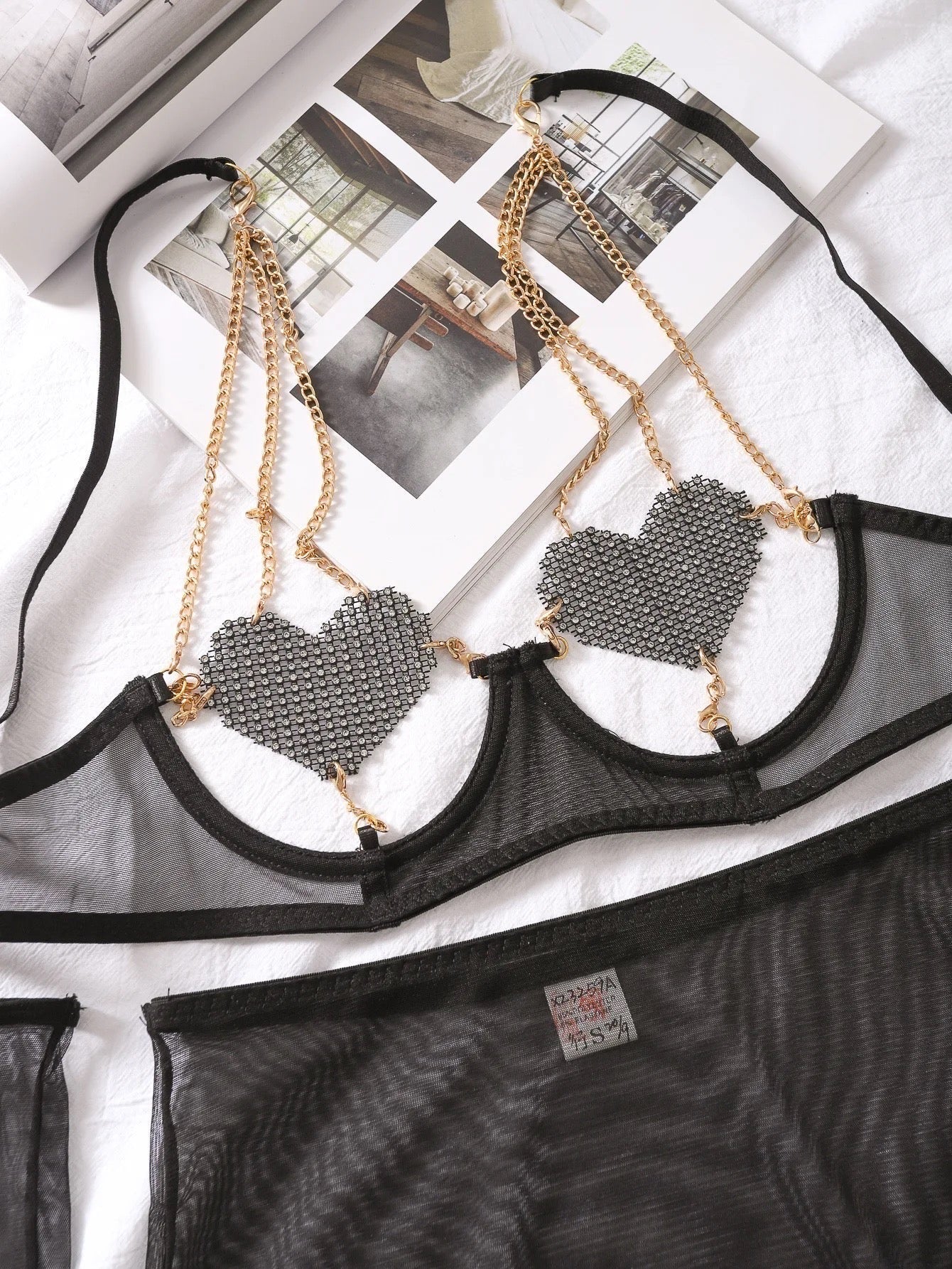 Black Lingerie Set With Heart Crystals Nipple Cover Bra