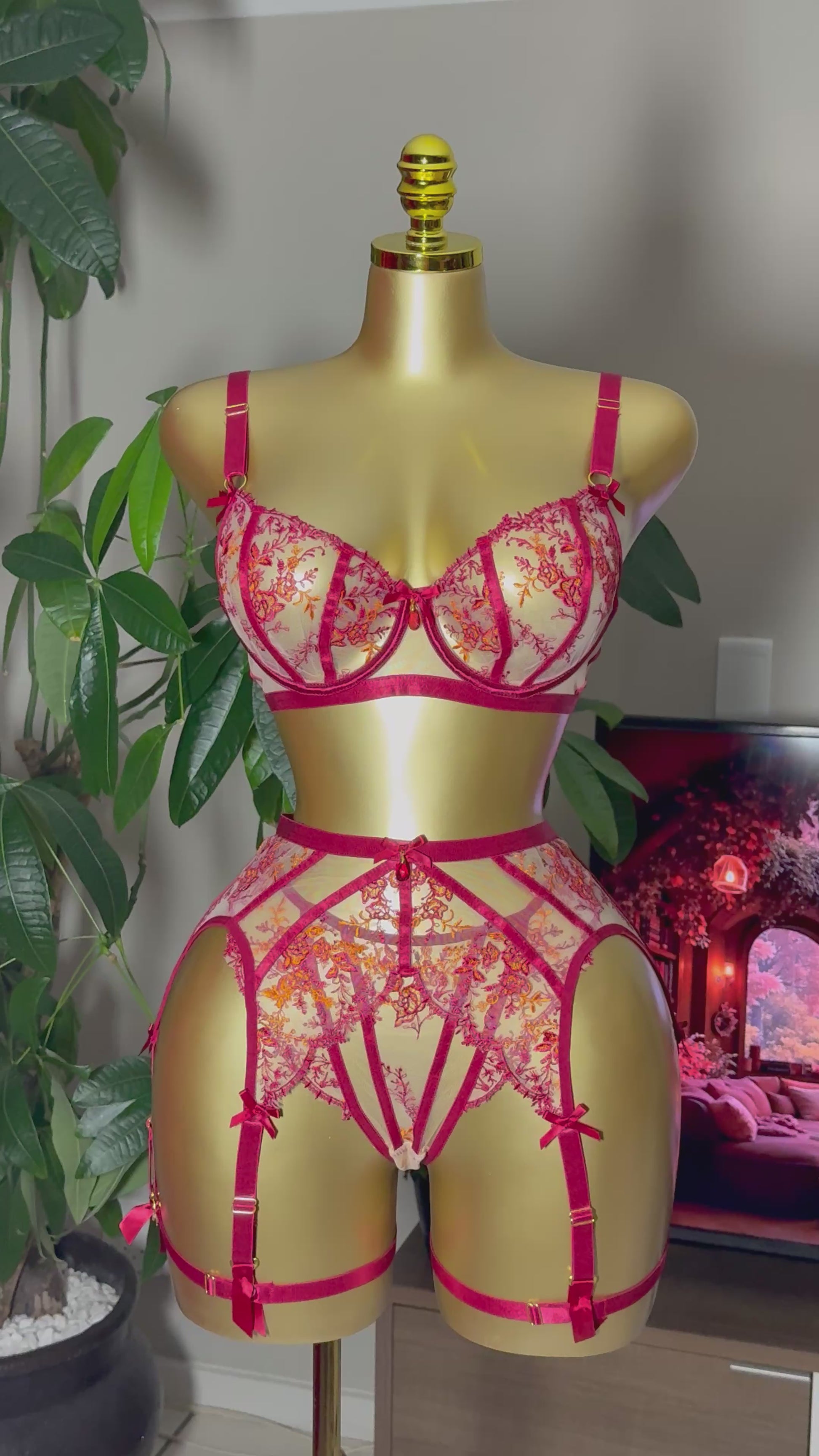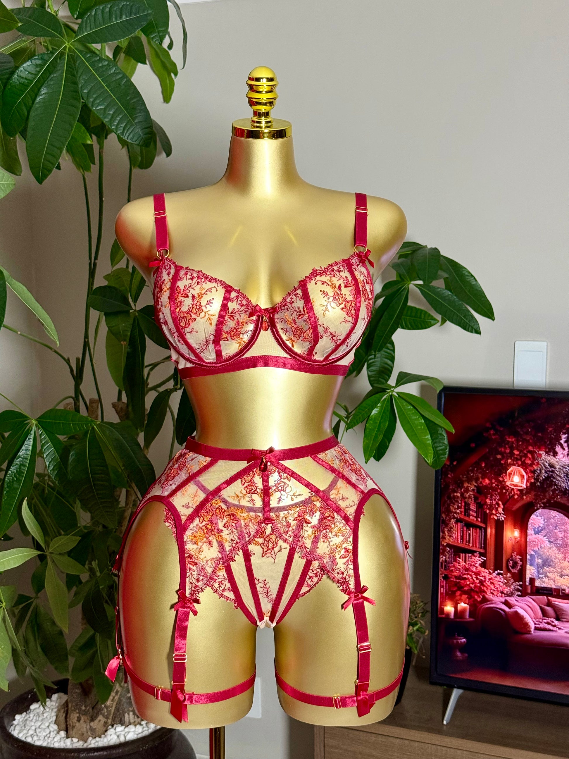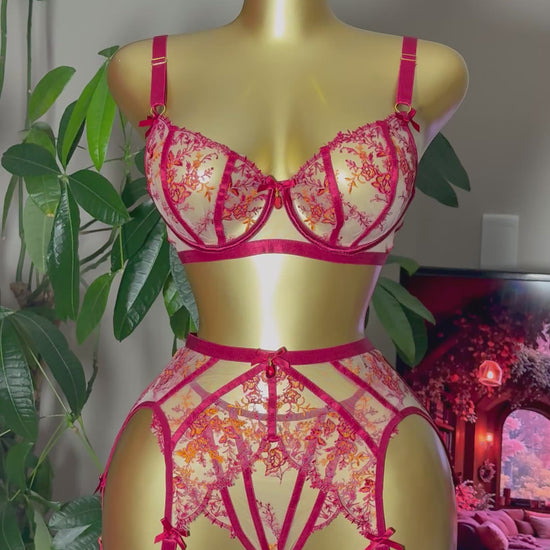 Romantic, elegant, and timeless — the Ms. Ember lingerie set is crafted from sheer mesh with delicate red and golden embroidery. Featuring a balconette bra, high-waist garter belt, and thong, this set is designed to highlight every curve with fiery sophistication. Available online across South Africa or at the Midnight Muse Brackenfell Showroom in Cape Town.