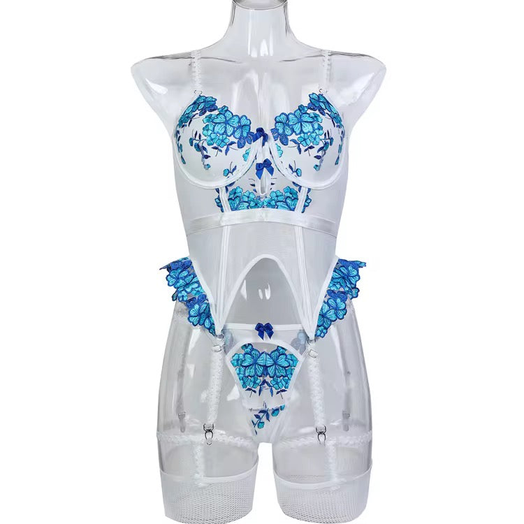 Blue Mesh Lingerie With Lace Clover Flower Design And Socks.