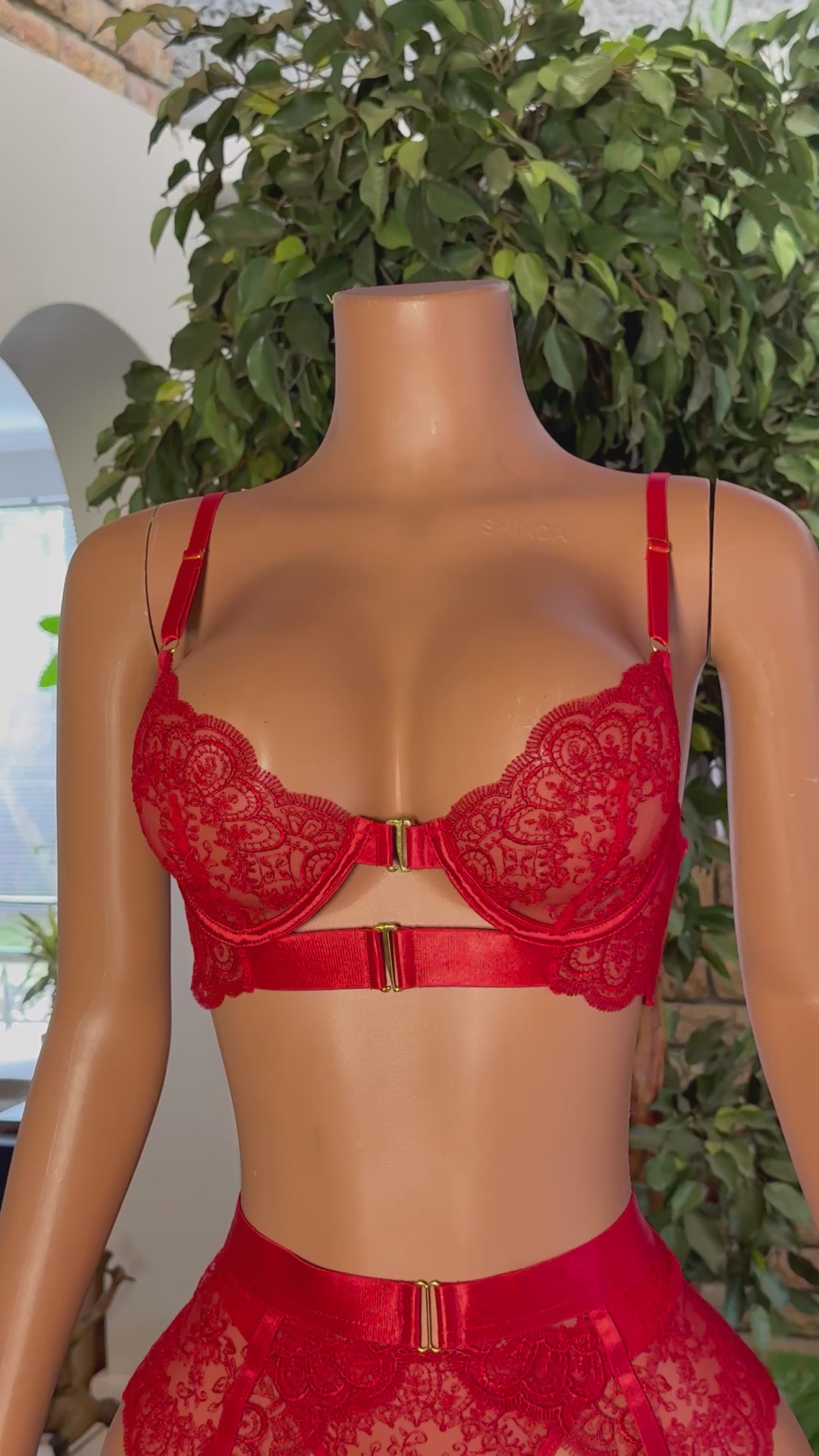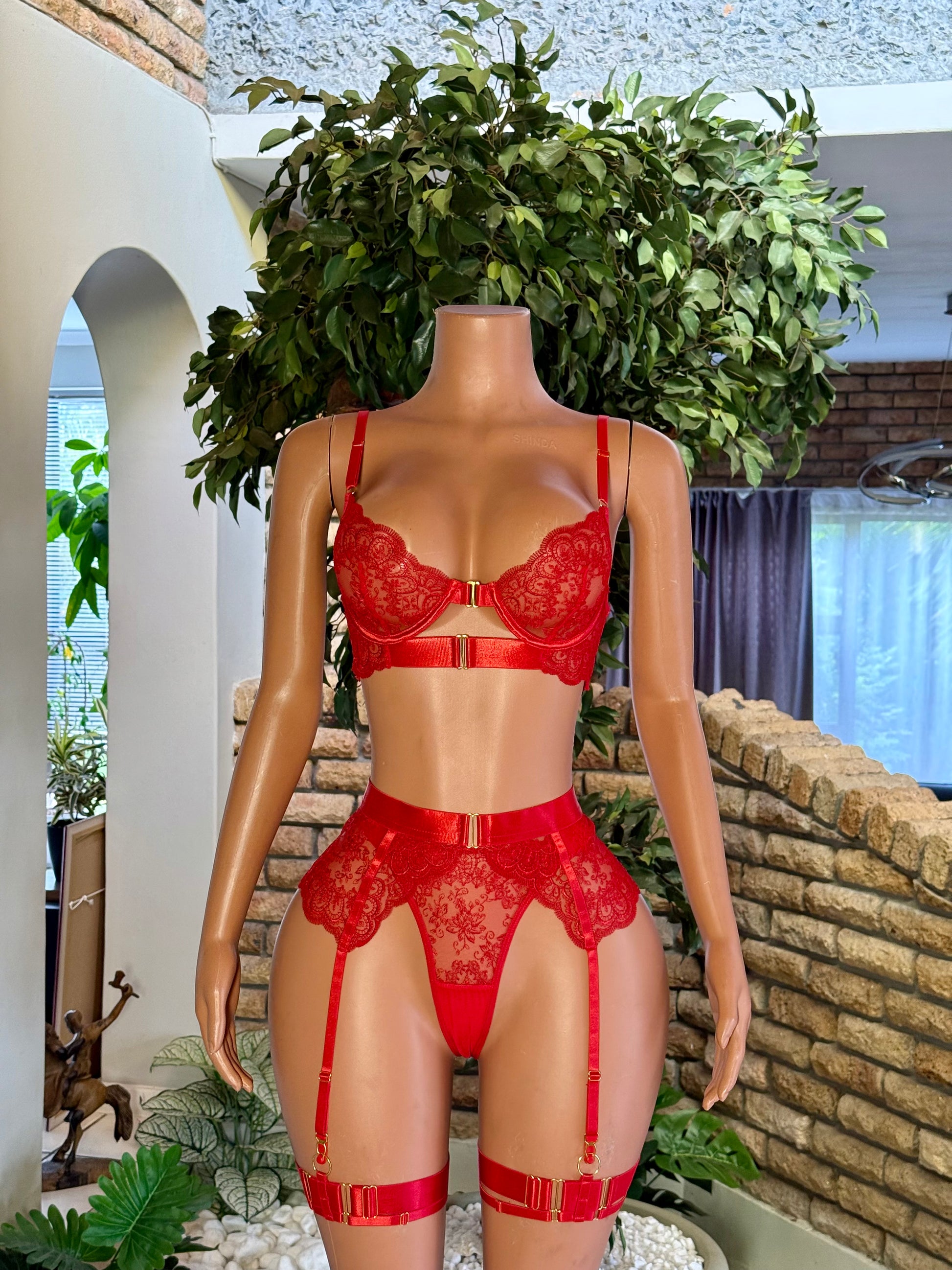 Meet the fiery twin of our best-selling black design – Ms. Zara in red. This three-piece lingerie set includes a lace underwire bra, coordinating thong, and a sultry garter belt with suspender straps. With the same flattering front design as the black edition but a more open, strappy back, Ms. Zara Red delivers passion with a daring finish. A bold essential for women who want to turn every night into a statement.