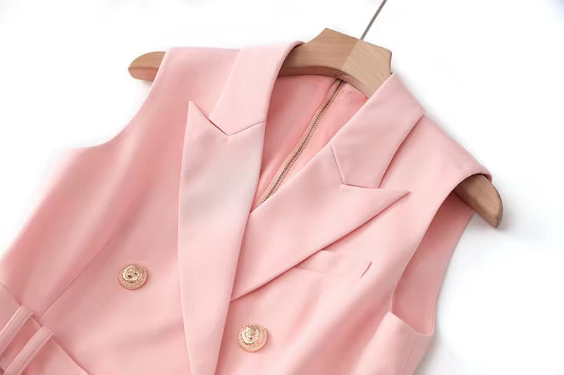 Elevate your style with The Victoria Sleeveless Blazer Dress, a sophisticated blend of power and elegance. This tailored design features a double-breasted front, sharp lapels, gold-toned buttons, and a statement belt with a bold “B” buckle, adding a refined touch to your wardrobe.
